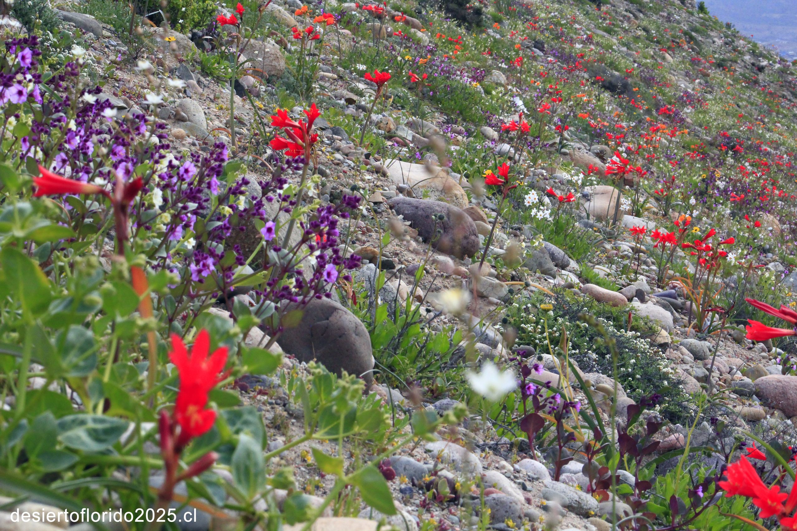 La primera foto muestra la carretera, un verdadero espectáculo visual justo en el límite con Vallenar. En un abrir y cerrar de ojos, la vegetación verde da paso a una explosión de colores en medio del árido desierto. Y en unas semanas mas un florecimiento de colores que se transforma en un impacto inmediato, una bienvenida vibrante que te sorprende en el camino desde el segundo 1.